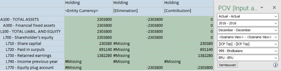 On holding level, the account A300-Financial fixed assets (aka participation in subsidiaries) is eliminated as it is posted against the subsidiaries ICP. This results in a contribution of ‘0’. The contra entry on [Elimination] is made against the L770 – Equity Plug Account, which is marked as the plug account of A300-Financial Fixed Assets in the metadata.